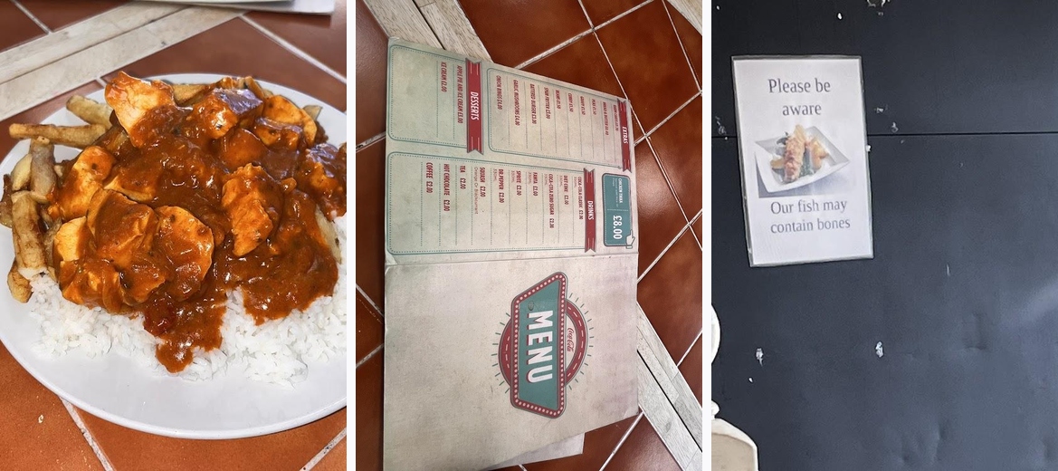 An excellent fish and chip shop with cafe and good seating area. I had chicken tikka with half chips, half rice and was piping hot with a good cup of hot coffee. Excellent staff, great customer service and answered all my questions I had Highly recommended 👍